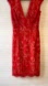 An ornate Frank Lyman textured cocktail dress. Thick threaded lace shell in a bold red colour adorned with red Swarovski rhinestones. Dress is fully lined, light padding in the chest. Nude netting across open V chest holds the garment in place.