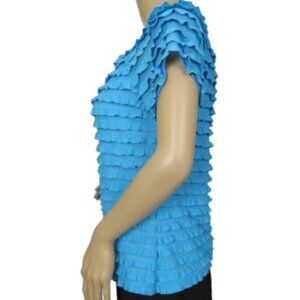 A cute and feminine blouse featuring layered light blue ruffles all over the fabric, perfect for a flirty, romantic look. The versatile design allows you to wear it either on the shoulders for a classic, more refined style or slightly off the shoulders for a playful, relaxed vibe. The short sleeves are gently puffed, adding a touch of softness, while the layers of ruffles create beautiful movement and texture. The blouse has a relaxed, flowing fit, and the lightweight fabric makes it ideal for warm weather. Whether you're dressing up for a casual outing or a more dressy occasion, this top offers comfort, style, and a fun, feminine touch.