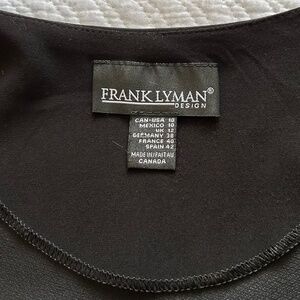 Frank Lyman Montreal Designs this Beautiful Classic Piece with a Twist! The Gold Zip Front , slight puff sleeve at shoulder, and Flattering Peplum Hem take it out of the ordinary, but in solid black jersey it is so versatile! Frank Lyman’s Signature Jersey 95%Polyester 5%Elastane. Dry Clean. Made in Canada! Size 10. Approx flat measurements: Bust18.25”, Waist16”, Hip21.25”, Sleeve24.75”, Shoulder14.25”, Length 24”.