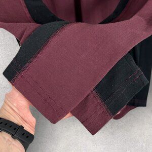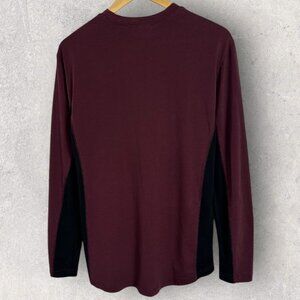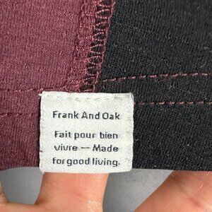 Frank and Oak Burgundy and Black Long Sleeve Crew Neck Tee in Men's Size Small. Relaxed fit. Made in China. Crew neckline. Lightweight mesh that is breathable. 81% poly and 14% cotton. Machine washable.