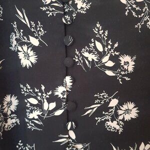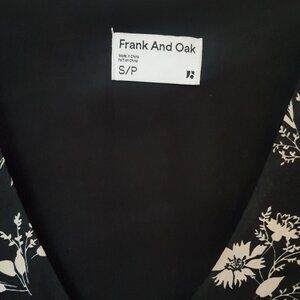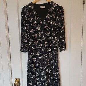 Frank + Oak Floral Midi Dress. Size small (pit to pit 17 inches; waist 14 inches; shoulder to hem 44 inches––would be a relaxed fit for a size 4 and more fitted for a size 6). I'm 5'8 and this falls mid-calf. Concealed side zipper. Lovely covered buttons at the front. Black with cream floral design. Fully lined. A drapey, fluid fabric that falls beautifully (fabric is Lenzing viscose). In excellent used condition (I've worn this a dozen times).