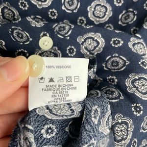 Stylish button-down shirt by Frank & Oak. Features a navy base with white circular patterns. Perfect for casual or formal wear.