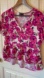 This top is short sleeved and perfect for your spring or summer closet. Flowers are have an array of pink colours plus some black and brown. Background is a very light cream colour.