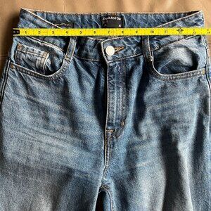 Frank And Oak denim in a classic mid-rise with a straight/slim leg. Soft, broken-in feel with just enough structure to hold their shape. The wash is a really nice everyday blue that works year-round. They hit right at the ankle on me (I’m 5'2), so they’d likely be a cropped or ankle length on someone taller. Comfortable, easy jeans you can dress up or down.