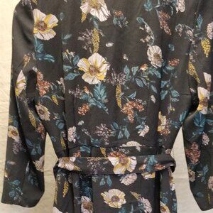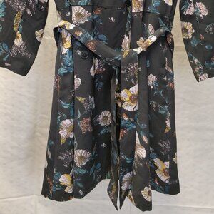 Beautiful F&O tie dress that could just as easily be worn open as a coat. Dress it up with accessories for a wedding, or casual with khakis and a white top for a winery tour. Includes a tie/belt as well. 100% polyester. Colourful Birds, butterflies and flowers on the black-based pattern.