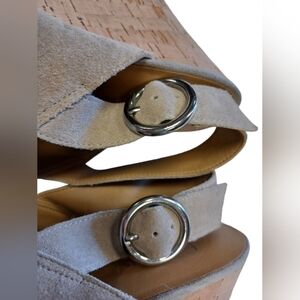 Fawn colored, these suede, wedge sandals feature open toes and adjustable buckles.