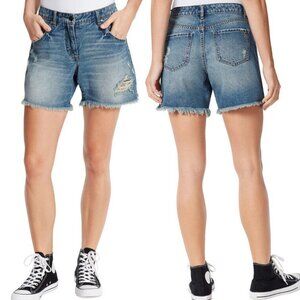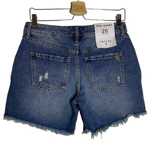 Frayed Mid Rise Midi Denim Jean Shorts Distressed Ripped Raw Hem Blue Wash 26