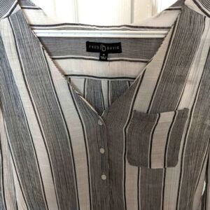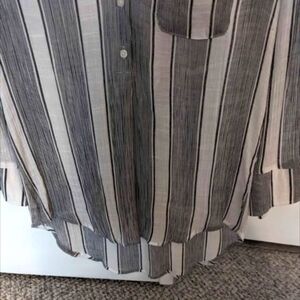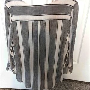 Elegant blouse with black and white stripes. Features a V-neck and front pocket. Ideal for versatile styling.