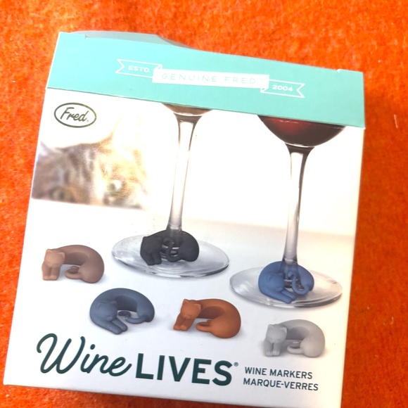 Fred & Friends Wine Lives Cute cats wine markers new in box. Set of 6 (six) cute kitties who wrap around the stem of your glass so you never have to guess which one is yours. Made of soft, food safe, BPA-free silicone. The flexible silicone design makes it a perfect fit for most stemmed drinkware including wine glasses, champagne flutes, martini glasses, and more. This item comes from a smoke free, pets friendly home. Recycled bags/box used when possible. Please, let me know if you'd like any additional info. Thanks for watching!