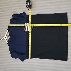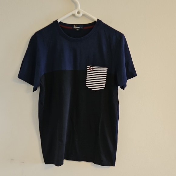 Dark blue short sleeve tee with a striped pocket. Casual and stylish design.