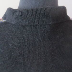 This listing is for a women's Fred Perry sweater with a Stewart like tartan design on the front. The tartan is diagonal and features red, blue, black, white and yellow on a heather grey background. The rest of the sweater is black. The knit is a medium weight. This sweater has a collar and there is the embroidered Fred Perry log on the chest.