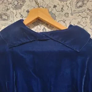 Luxurious blue velvet robe. Elegant design with a soft feel. Perfect for lounging with a martini. Slash pockets and beaded cuffs.