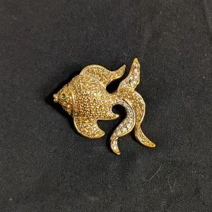 Beautiful gold coloured goldfish brooch with light blue eye jewel, and simulated diamonds and yellow jewels