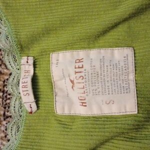 Green ribbed tank top with lace on straps, size small, Hollister, cropped (rough hem), good condition.