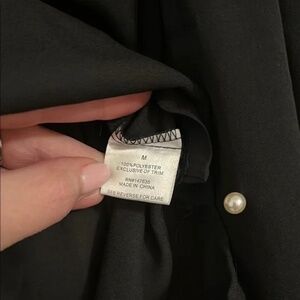 This elegant black button front blouse showcases long puff sleeves with delicate pearl accents, offering a stylish elegant contrast to its solid body. The notched collar adds a touch of sophistication, making it a versatile piece for any occasion. Size medium.