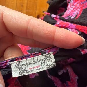 Lightweight black tunic with bold pink floral-scroll print. Deep V-neck with tie detail. Relaxed, flowy silhouette with long sleeves. Worn once.
