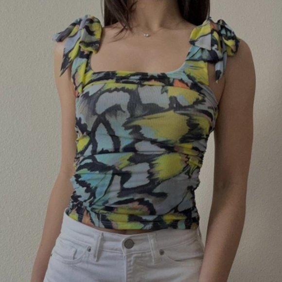 A bold print and tie detail at the shoulders add breezy charm to this lightweight tank top with a gathered bodice creating a fitted silhouette. 18 1/2" length (size Medium) Lined 95% polyamide, 5% elastane Machine wash, tumble dry