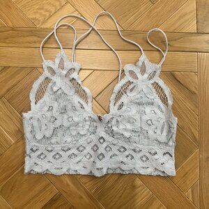Boho-inspired bralette featuring a crochet lace design with a stretchy smocked back design. Adjustable crossed straps. Lined at the bust. In excellent condition