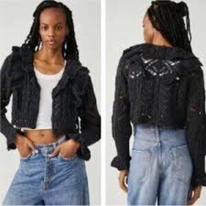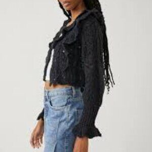 The perfect finishing touch to any look, this forever classic cardigan is featured in an open knit design with exaggerated ruffle detailing for an added special touch.