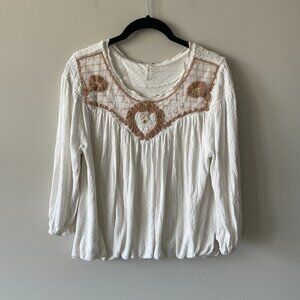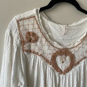 Free People Begonia Tee Embroidered Blouse Top White Brown Small