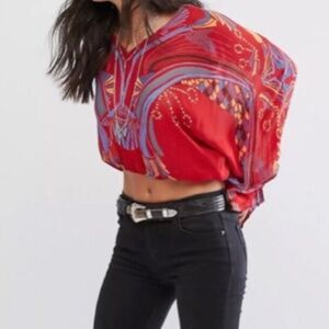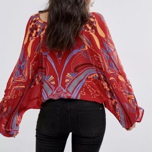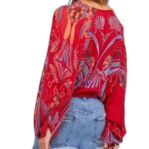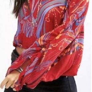 Free People Beneath The Sea Boho Indie top. Color: Red/Multi. SIZE: XS (see attached Free People size guide). Bold color palette makes this patterned blouse pop with bohemian spirit. Features: