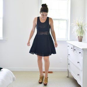 Beautiful black lined lace dress with crocheted, cut-out daisy midsection by Free People. Fit and flare cut and excellent used condition.