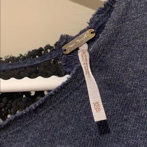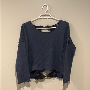 EUC Free People blue cropped sweatshirt with black crocheted back and distressed hem in women’s size extra small (XS).
