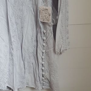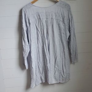 This new light blue tunic is beautiful with embroidery details is extra flowy. It has a beautiful row of buttons on each side of the top, and a front and back pleat. Tags are attached along with an extra button and some thread. A great summer top with shorts or jeans!