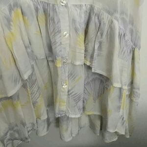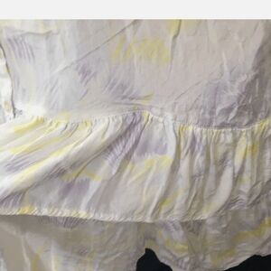 Love the subtle tie dye water color lavender and yellow print. Button down all the way. Size small. No flaws! It is loose and flowy. High low double ruffle hem. Size XS