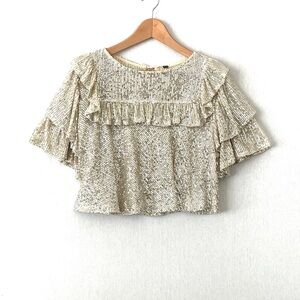 Free People Dance Floor Sequin Ruffle Top Size Small Great condition This top is so fun! Sequin adorned top featured in a tiered ruffle style with double back ties in a cropped silhouette. The sequins are a Silver/gold color. Approximate measurements Pit to pit 18” Length 18”