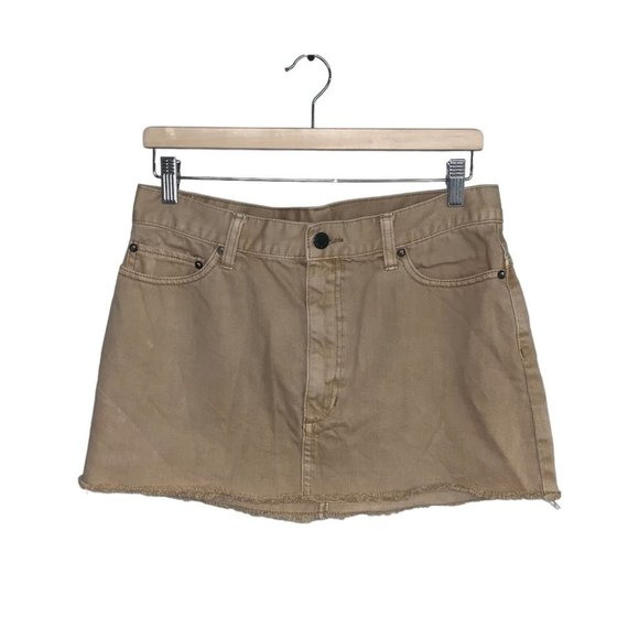 Free People Denim Mini Skirt Tan Frayed Hem Bohemian Boho Stitching Women Size 8