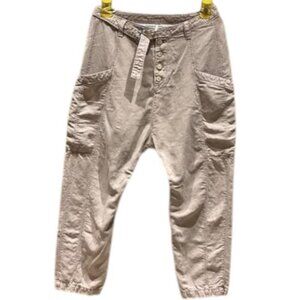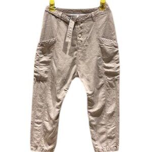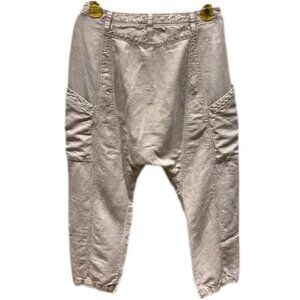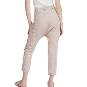 So cool and slouchy harem-style pants from the brand "Free People" in a light beige color. The pants feature a relaxed, harem-style silhouette with a dropped crotch and tapered legs. Have a button-fly closure, a self-tie belt at the waist, and multiple pockets, including cargo pockets on the sides for added shape.