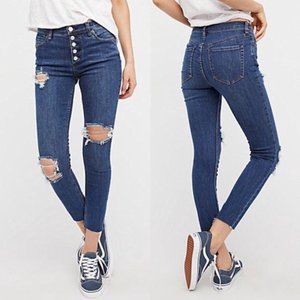 Cut in a mid-rise with a super skinny leg, these stretchy jeans feature distressed detailing.