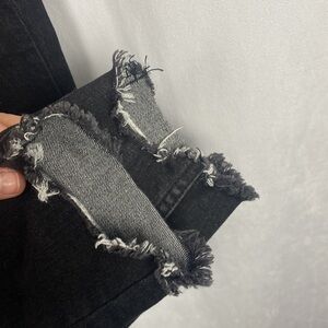These jeans are the perfect addition to any fashion-forward wardrobe. The distressed and faded black finish gives them a cool, vintage-inspired look that's sure to turn heads. Plus, the raw hem and knee cut detailing add an edgy touch that's both fashionable and functional.