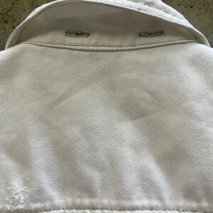 Distressed denim jacket with attached knit sleeves by Free People. Button front closure and two front slit pockets. All over roughed look. A cool piece to add a tomboy edge to any look.