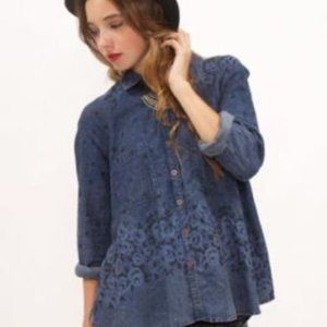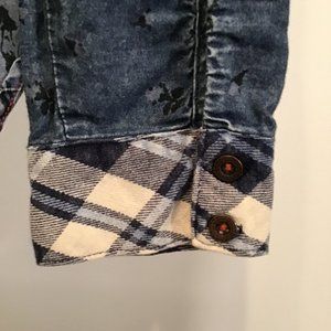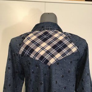 Denim chambray button down with alternating floral and plaid prints throughout. Features two open chest pockets, and two button cuffs with keyhole slit. Flares out through the hips so it hangs nicely without being constricting.