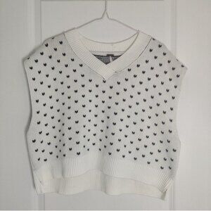 Chic and cozy, this white knit vest features a playful black heart pattern in a relaxed silhouette. Perfect for layering over blouses, turtlenecks, or dresses for a casual yet stylish look.