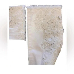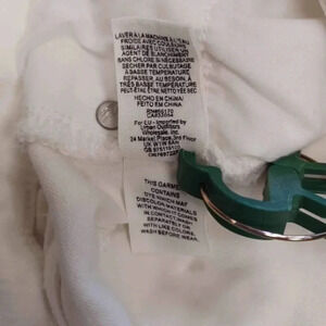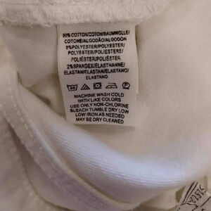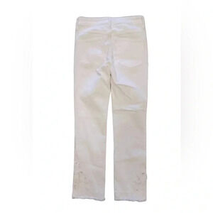 White in color, these cotton pants are a five pocket design with belt loops. The legs are straight and have cutout patterns and embroidery ending in raw hem. They close with a button and zipper and have some stretch