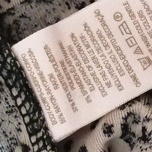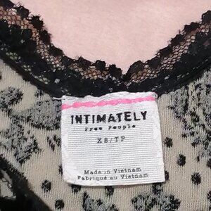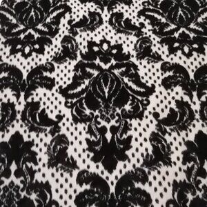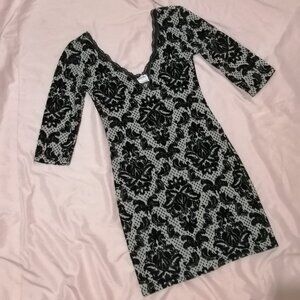 This listing is for a dress made by Free People; the style name is Fair Maiden. This lovely dress features a pretty damask pattern of cement created in a burnout style against a "nude" background colour. It has elbow length sleeves and delicate black lace along the neckline. It is in perfect, like new condition. This dress can stand on its own with heels etc for a very dressy look, or pair with boots and sweater to be more casual-- a nice, versatile piece! From seam-to-seam in the underarms it measures 15", but as it's made of 8% spandex it does have quite a bit of stretch. The rest of the fabric composition is 55% rayon and 37% polyester.