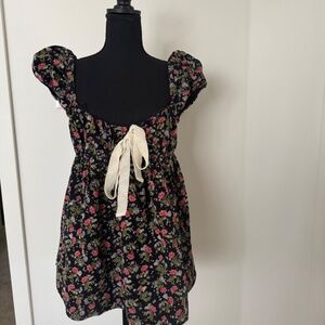 Free People mini dress with floral print, tie front, puff sleeves, and empire waist. Black base with multicolor flowers. Flowy, boho, romantic, and festival-ready. Excellent condition.