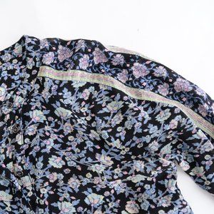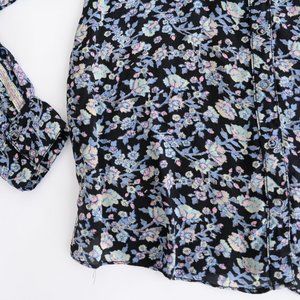 Chic floral button down shirt. Features a blend of black and blue hues. Perfect for casual wear.
