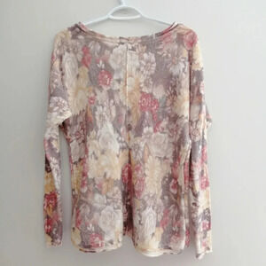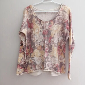 ° Floral sweater in palette of yellows, pinks, soft red, burgundy/brown on a cream backdrop