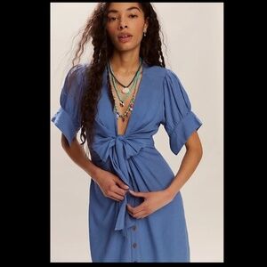 This stunning Free People midi dress brings effortless summer style with its soft, lightweight fabric and flattering silhouette. Designed with a deep V-neckline, dramatic front tie detail, and full button-down front, it’s equal parts laid-back and eye-catching. The rolled short sleeves add a casual touch while the relaxed drape ensures comfort. Whether you pair it with sandals for the beach or dress it up with wedges for a night out, this dress is perfect for warmer days and breezy evenings.