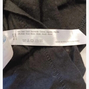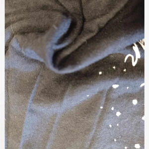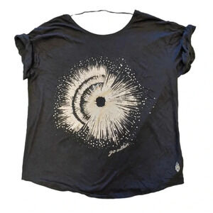 Black with a white design, this t-shirt features rolled cuffs and a neck strap worn in the back, stretchy and soft.