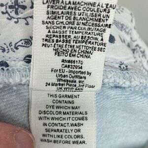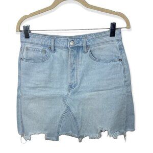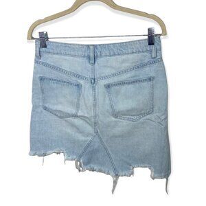 Free People Going Rogue Denim Skirt in Light Wash and Women's Size 26 (fits like a small). Button fly. Pieced denim skirt featured in a mini length. Uneven raw hem. High waisted. five pocket style. 100% cotton. Machine washable. Very good pre-loved condition. No visible flaws.