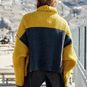 Chic mustard sweater with bold black geometric design. Cozy cowl neck for added warmth.