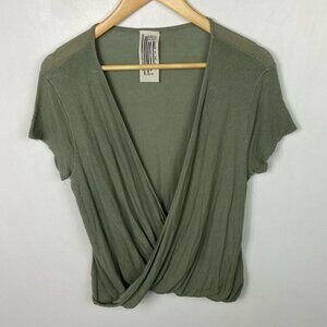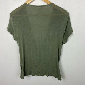 Free People Hoffman Army Green V-Neck Slouchy Tee in Women's Size XS. 95% rayon and 5% spandex. Lightweight short sleeve tee featuring a surplice front detailing. Back is semi-sheer. Very good pre-loved condition. No visible flaws.