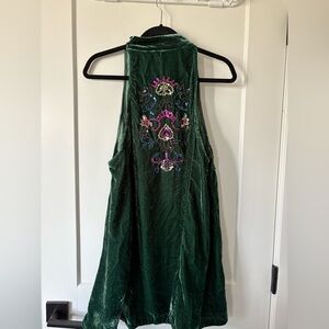 Chic green velvet mini dress with intricate embroidery. Ideal for stylish outfits.