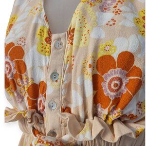 The Free People Daisy Dreams jumpsuit features a retro cream and orange floral pattern, ideal for a summery bohemian look. Designed with a stretch waist and halter neck, this jumpsuit combines comfort with a unique, vintage aesthetic.