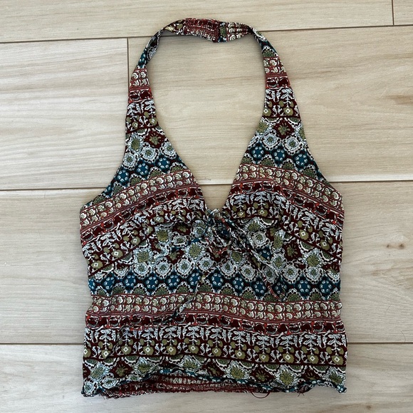 Stylish halter neck top featuring a vibrant pattern. Perfect for casual outings or a day at the beach. Available in a mix of earthy tones. Size XS- smocked back makes it stretchy.